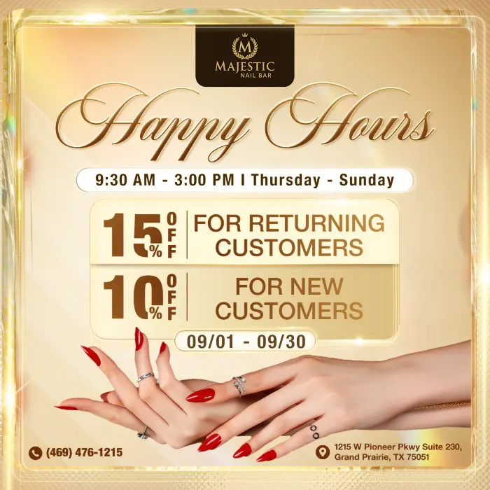Welcome to Majestic Nail Bar, where each appointment is more than a service — it’s a royal treatment. Located in the heart of Grand Prairie, our salon was built on the belief that beauty should be indulgent, relaxing, and unforgettable. From everyday polish to special occasion glam, we deliver stunning results with a warm, personal touch. Our mission is simple: help you look and feel your best, every time you visit. Nail Salon on W Pioneer Pkwy, Grand Prairie, TX 75051, Majestic Nail Bar offers luxurious nail services with expert care and top-tier hygiene.
