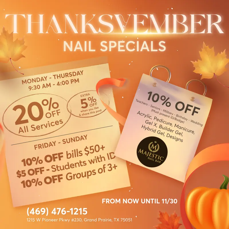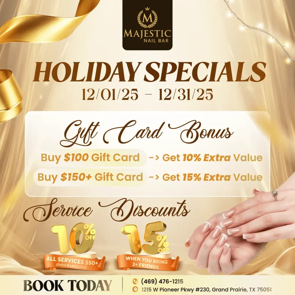 Welcome to Majestic Nail Bar, where each appointment is more than a service — it’s a royal treatment. Located in the heart of Grand Prairie, our salon was built on the belief that beauty should be indulgent, relaxing, and unforgettable. From everyday polish to special occasion glam, we deliver stunning results with a warm, personal touch. Our mission is simple: help you look and feel your best, every time you visit. Nail Salon on W Pioneer Pkwy, Grand Prairie, TX 75051, Majestic Nail Bar offers luxurious nail services with expert care and top-tier hygiene.
