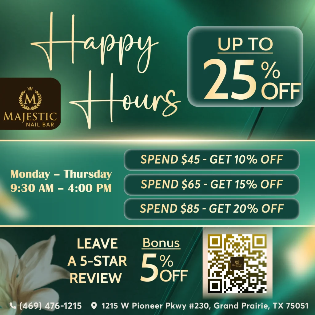 Welcome to Majestic Nail Bar, where each appointment is more than a service — it’s a royal treatment. Located in the heart of Grand Prairie, our salon was built on the belief that beauty should be indulgent, relaxing, and unforgettable. From everyday polish to special occasion glam, we deliver stunning results with a warm, personal touch. Our mission is simple: help you look and feel your best, every time you visit. Nail Salon on W Pioneer Pkwy, Grand Prairie, TX 75051, Majestic Nail Bar offers luxurious nail services with expert care and top-tier hygiene.